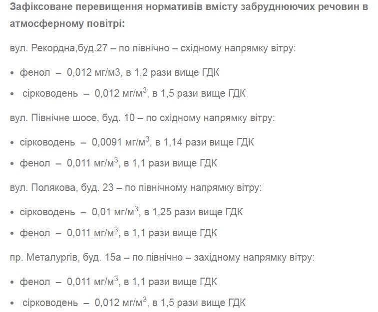 Здебільшого серед активних хімічних речовин виявляється: фенол, сірководень та формальдегіди, що перевищують загальну норму у 1,5- 2 рази.