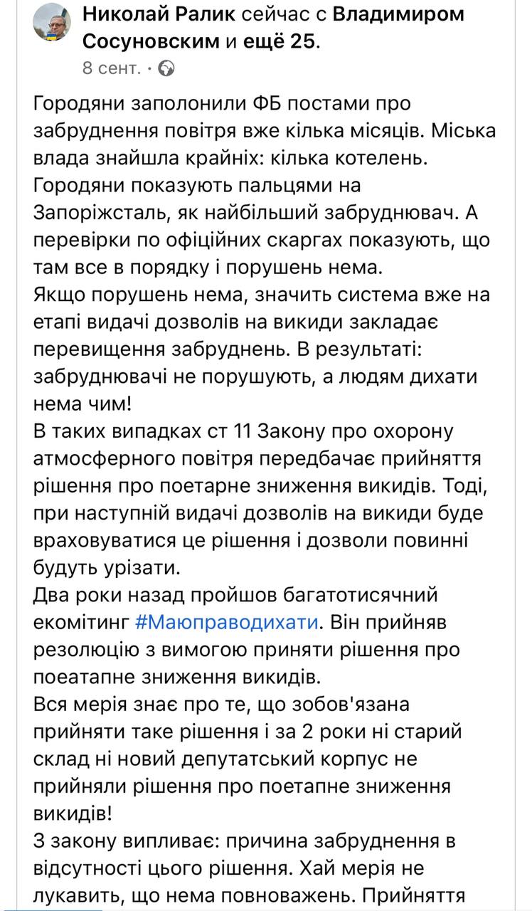 Попри видимість роботи міської ради щодо пошуку винних у забрудненні повітря, активні громадські діячі Запоріжжя «гадають думку», чому виконком не звертає уваги на найбільше підприємство міста – «Запоріжсталь». Про це зауважив у своєму Facebook Микола Ралик.