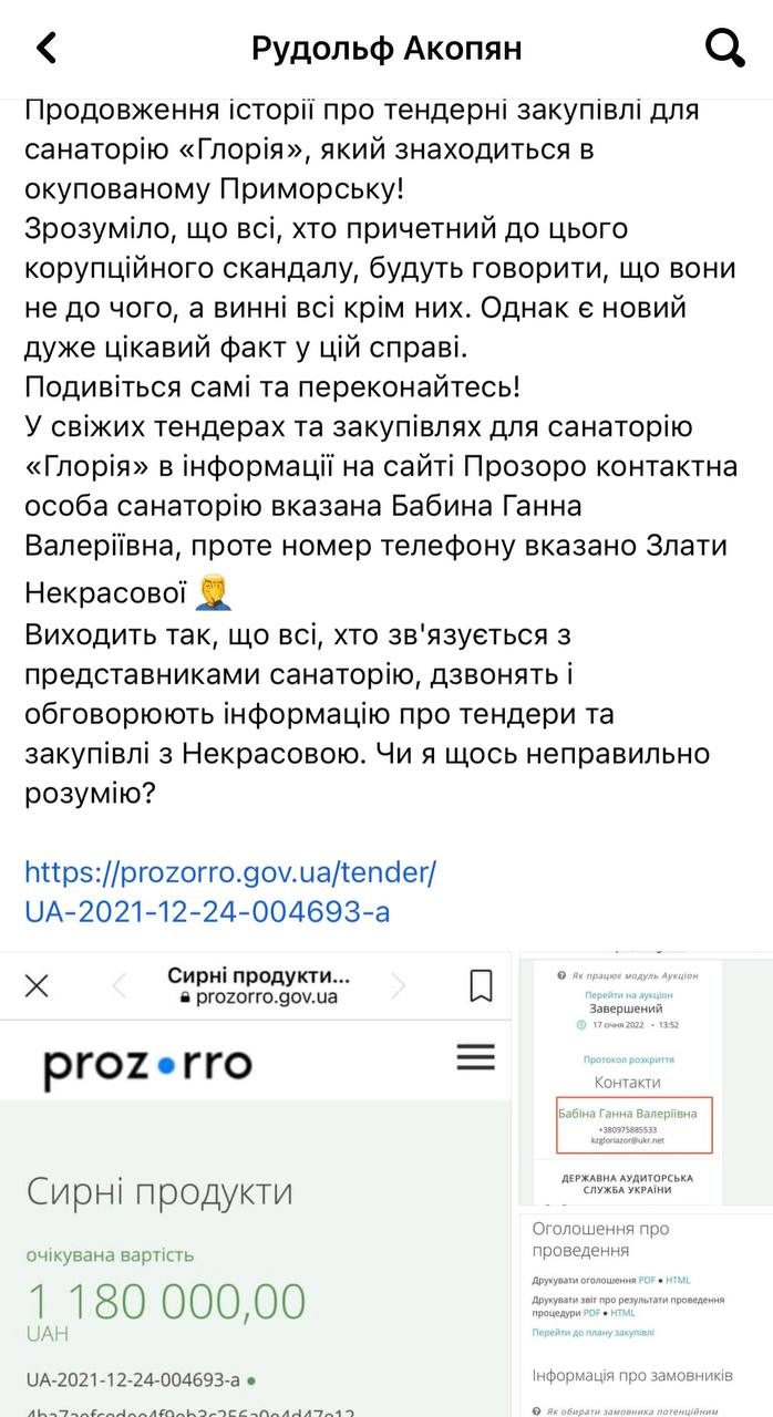 Нагадаємо, ми писали про те, що запорізький волонтер Рудольф Акопян на своїй сторінці у Фейсбуці розмістив інформацію про те, що до тендерних закупівель для санаторію «Глорія» причетна заступник голови ЗОДА Злата Некрасова.
