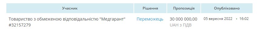 Єдиним учасником аукціону стала компанія «Медгарант», яка не торгуючись, погодилась на запропоновану суму.