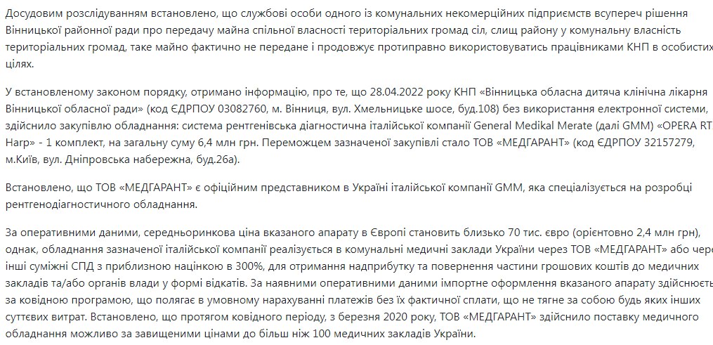 Згідно з ухвалою суду «Медгарант» було помічено у корупційних схемах з надання послуг КНП «Вінницька обласна дитяча клінічна лікарня Вінницької обласної ради», де заклад без оголошеного тендеру придбав у ТОВ рентгенівську систему, на загальну суму 6,4 млн грн, «з приблизною націнкою в 300%, для отримання надприбутку та повернення частини грошових коштів до медичних закладів та/або органів влади у формі відкатів» – йдеться у документі. Аналогічна ситуація склалась із закупівлею рентгенівського апарату для  Національного Інституту раку.