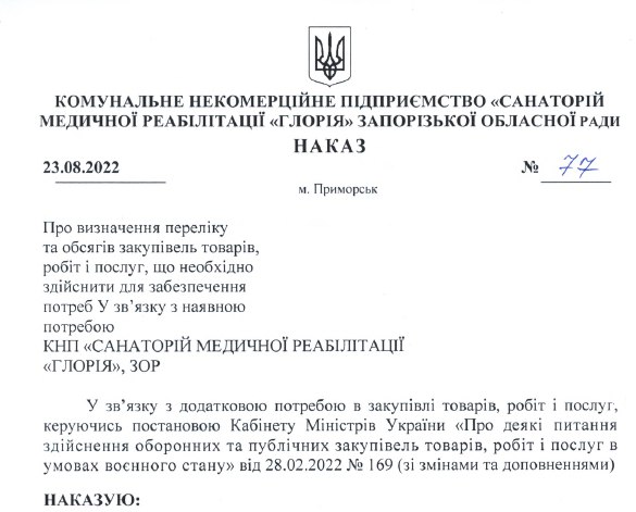 Згідно з наказом, аукціон оголошений у зв’язку з «додатковою потребою в закупівлі товарів, робіт та послуг, керуючись постановою Кабінету Міністрів України «Про деякі питання здійснення оборонних та публічних закупівель товарів, робіт та послуг в умовах воєнного стану». Тобто некомерційний заклад хоче придбати томограф для воєнних потреб, проте чиїх саме, якщо місце знаходиться в окупації – невідомо. Також дивовижно те, що у тендері вказана кінцева дата постачання товару – 21 листопада 2022 року. Може керівництво «Глорії» знає дещо більше, ніж всі, та передрікає скору деокупацію частини запорізького краю?
