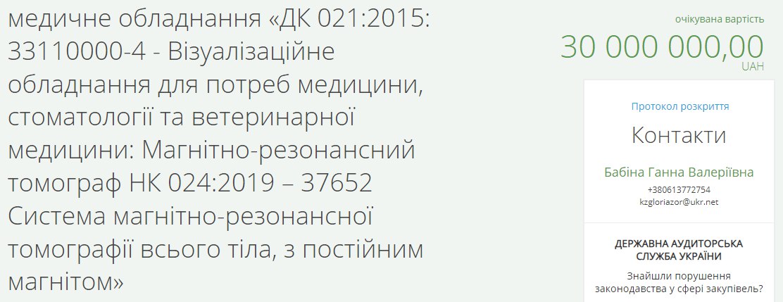 25 серпня 2022 року, на сайті електронних публічних закупівель Prozorrо, комунальним некомерційним підприємством «Санаторій медичної реабілітації «Глорія» Запорізької обласної ради, було оголошено тендер на придбання магнітно-резонансного томографа «для потреб медицини, стоматології та ветеринарної медицини», очікуваної вартості – 30 мільйонів гривень.