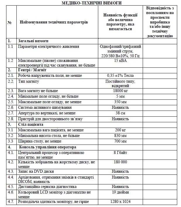 Згідно з медико-медичних вимог, замовник потребує прилад, який відповідає вимогам для дослідження усіх частин тіла, як в загальний медичній практиці, так в спеціалізованих дослідницьких цілях. Крім того, робоча напруженість поля прибора, повинна мати не менше 0,35 ±1% Тесла та повністю цифрову послідовність візуалізації.